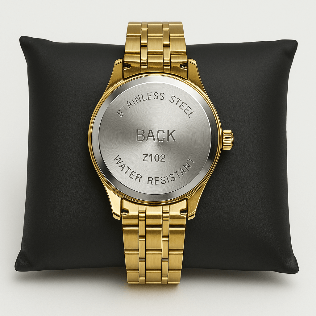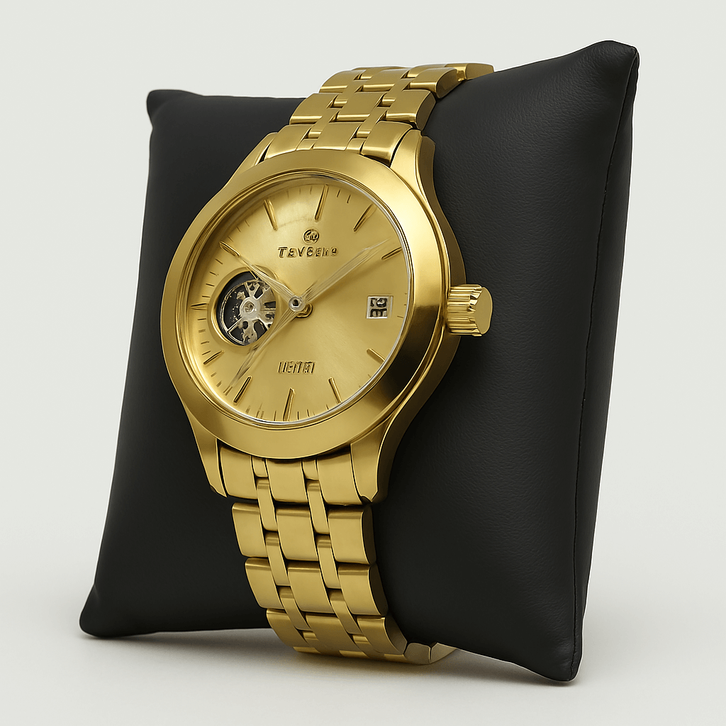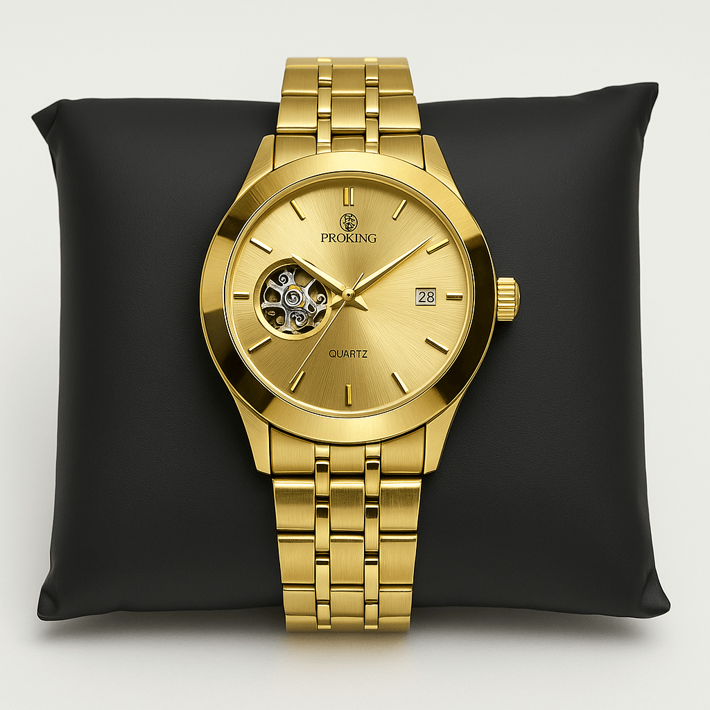 Add a touch of elegance to your style with the ProKing Gold-Tone Automatic Wristwatch. Featuring a stunning open-heart skeleton design, this timepiece showcases the inner mechanics through a cutout on the dial. The gold-tone stainless steel case and matching three-link bracelet give it a premium look, while the quartz movement ensures reliable timekeeping. Whether for casual wear or formal occasions, this watch blends classic design with modern flair. Comes beautifully presented on a black cushion—perfect for gifting or personal use.